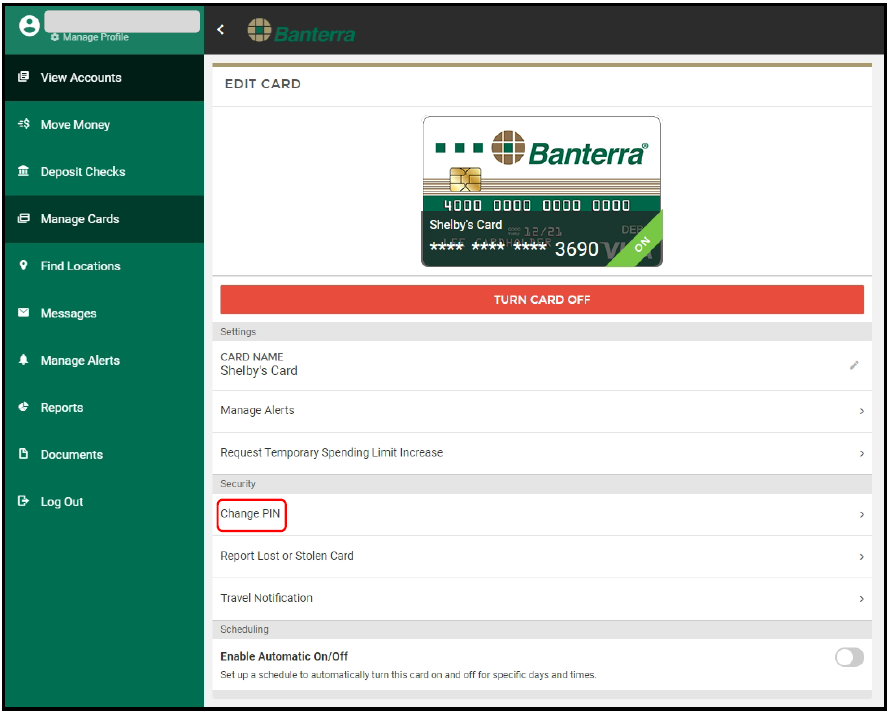 It is easy to manage your Banterra Bank Visa Debit Card through digital banking. Watch the video above or follow the written instructions above to change the PIN associated with your debit card.